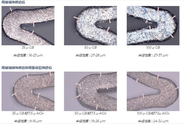 經(jīng)過吉川公司工藝工程師測試,用氧化鋁砂進行定向的噴砂處理可以去除氧化層,平滑表面缺陷并改善外圍支架的表面質量。支架的受損區(qū)域很脆,但基礎材料鎳鈦諾卻具有延展性。氧化鋁噴砂磨料使用去氧化層,并且對韌性基體的侵蝕最小,從而在支架撐桿的整個長度上形成均勻的表面光潔度。 市場最新的支架設計和醫(yī)療植入物要求更大的邊緣倒圓角。圓形邊緣降低了被植入物卡住,其他風險的可能性。氧化鋁微噴丸的半徑為5-15 m,但新的幾何尺寸指定為接近25 m。該半徑可以通過三種途徑實現(xiàn):延長噴砂周期,使用更大尺寸的氧化鋁或完全使用其他磨料。通過測試,我們了解到更長的噴砂周期可以去除更多的團塊,而較大尺寸的氧化鋁會產(chǎn)生過于粗糙而無法拋光的表面。畢竟,氧化鋁顆粒的形狀為塊狀,邊緣稍尖。這給了我們一個可行的選擇:嘗試使用其他類型的磨料。為了克服這一障礙,我們測試了幾種類型的介質,發(fā)現(xiàn)用玻璃珠噴砂可以在拐角處形成所需的半徑(最大30 m),而不會除去設備的額外質量。結果是氧化鋁的質量提高了十倍。經(jīng)過吉川公司工藝工程師的測試事實說明了結果的差異。用氧化鋁噴砂處理過的樣品的半徑僅為8-13 m,而用玻璃珠噴砂處理過的樣品的半徑為24-30 m。 經(jīng)過吉川公司工藝工程師最終測試事實證明,最好的心臟支架噴砂工藝需要用氧化鋁砂粗噴砂、再用玻璃珠微噴砂是目前最好的一種噴砂工藝方式。 經(jīng)過粗噴、微噴的產(chǎn)品外徑和內(nèi)徑轉角處的半徑可以實現(xiàn),而所需的附加材料去除最少。半徑的大小可以有效地控制,因為它是基于圓形磨料,玻璃珠的大小和速度的??梢钥刂凭哂懈郊影霃降闹Ъ軈^(qū)域。通過機械加工表面,有助于保持支架的疲勞壽命。玻璃珠磨料通常用于必須保持嚴格公差的噴丸處理應用中。玻璃珠對支架表面進行噴丸處理,不會去除任何材料或數(shù)量可忽略不計的材料。如下所示,玻璃珠的尺寸很重要。玻璃珠的尺寸越大;邊緣越圓。玻璃珠有35 ,50 和100 兩種。讓我們看一下使用每種尺寸的樣本測試的結果。此處顯示的未噴砂的支架表面(500x)邊緣鋒利,并受到制造損壞。半徑范圍僅為3-8 m。為什么用兩種磨料處理比單獨用氧化鋁處理好? 玻璃珠無法消除制造過程中產(chǎn)生的浮渣,回彈和其他損壞;只有氧化鋁可以。氧化鋁不能產(chǎn)生真正的圓形邊緣。但是,它確實可以提供電拋光所需的理想表面光潔度。一個不能替代另一個。通過使用多步驟過程,植入物表面可以使用經(jīng)過驗證的相同設備獲得兩全其美的效果。在該過程中添加第二種研磨劑聽起來可能需要更多的勞動力,但實際上比其他修邊過程更有效。例如,電拋光可以產(chǎn)生較大的半徑,但它也會從整個零件中去除過多的材料,而不僅僅是角部,從而損害了支架的疲勞壽命。